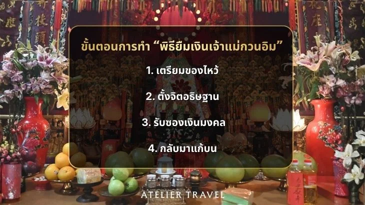กล่าวชื่อ–นามสกุล วันเดือนปีเกิด แจ้งจำนวนเงินที่ต้องการยืม และเป้าหมายอย่างชัดเจนในพิธียืมเงินเจ้าแม่กวนอิม